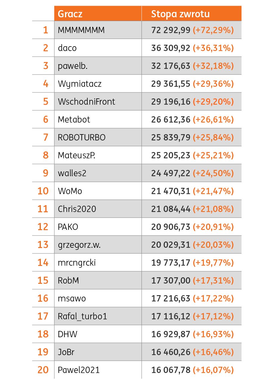 Najlepszy gracz w konkursie wewnętrznym uzyskał stopę zwrotu w wysokości 72 proc. To rewelacyjny wynik i życzymy jego powtórki na prawdziwym koncie maklerskim. Oto lista zwycięzców: