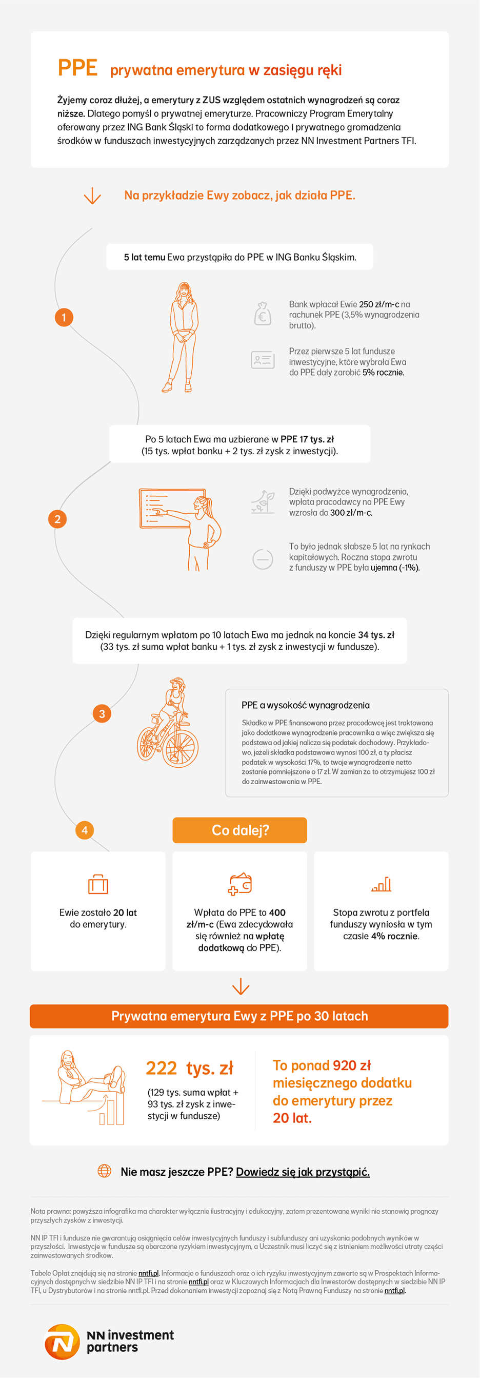 Na prostym przykładzie Ewy (patrz infografika) pokazujemy więc zalety długoterminowego inwestowania za pośrednictwem PPE — jaką moc ma regularność wpłat pracodawcy i jak na korzyść uczestników działa magia procentu składanego.