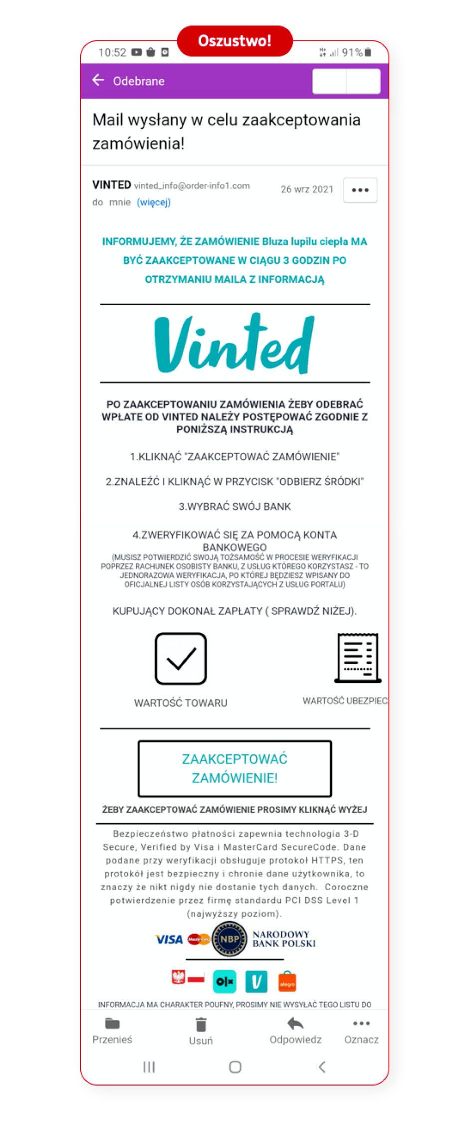Oszuści wykorzystują najbardziej popularne portale internetowe, aby wyłudzić pieniądze. Jeżeli sprzedajesz lub kupujesz w internecie, zachowaj szczególną czujność. Możesz otrzymać prośbę o podanie kodu BLIK, bo kupujący chce zapłacić w ten sposób za towar – pamiętaj, że podając kod BLIK nie otrzymasz przelewu, możesz natomiast umożliwić oszustowi wypłatę z Twojego rachunku! Możesz też otrzymać w portalu Vinted informację, że ktoś kupił Twój towar i prosi o dokończenie transakcji w mailu. Klikając w link z takiej wiadomości, możesz zostać przekierowany do fałszywej strony logowania, gdzie oszuści pozyskają Twoje dane do logowania. Zanim się obejrzysz, stracisz wszystkie pieniądze.
