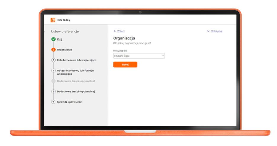 Odwiedzając ING Today, po raz pierwszy dodasz swoje preferencje, dzięki którym zobaczysz potrzebne informacje i aktualności. Możesz wybrać podstawową rolę biznesową i dodatkową rolę wsparcia – ma to na celu dostosowanie użytkowników pracujących w funkcji wsparcia, np. IT, Finanse – przy jednoczesnym wspieraniu określonej roli biznesowej, do której potrzebują treści w codziennej pracy.