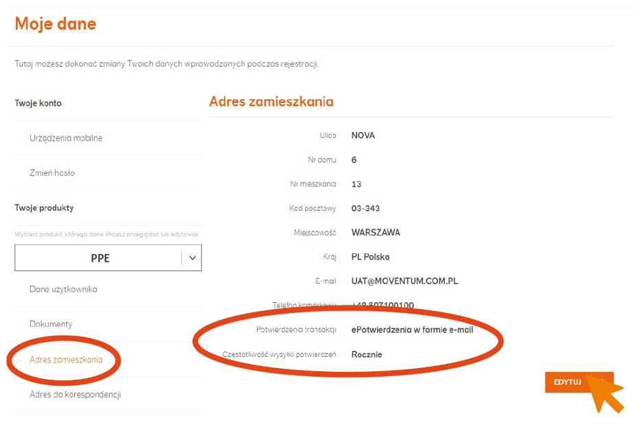 - W zakładce „Adres zamieszkania” możesz zmienić zarówno formę otrzymywania potwierdzenia transakcji (papierowa lub elektroniczna), jak i częstotliwość (rocznie lub po każdej transakcji).