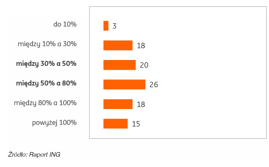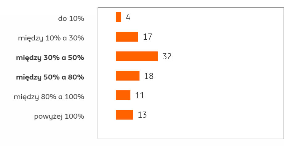 Trudna sytuacja energetyczna powoduje, że firmy zmagają się z wyższymi kosztami działalności – najczęściej (26 proc.) uważają, że ceny paliw i energii wzrosły między 50 a 80 proc. Jeśli chodzi o przewidywane wzrosty ceny energii w perspektywie najbliższego roku, to firmy w dalszym ciągu spodziewają się wysokich podwyżek, choć niższych niż w przeszłości. Najczęstszą odpowiedzią (32 proc.) jest wskazanie na wzrost w przedziale 30–50 proc.