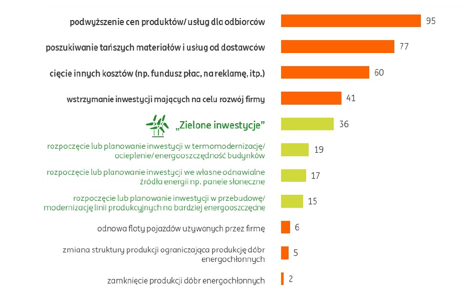 Prawie wszystkie (95 proc.) ankietowane przedsiębiorstwa zareagowały na podwyższone koszty energii i paliw podniesieniem cen własnych produktów lub usług. Firmy starają się dostosować do obecnej sytuacji poprzez poszukiwanie tańszych dostawców lub materiałów – robi tak 77 proc. MŚP. Z kolei 36 proc. firm jest zainteresowanych „zielonymi inwestycjami”. Wzrosła bowiem świadomość, że podniesienie efektywności energetycznej i własne źródła energii stają się w wielu wypadkach elementami bezpieczeństwa i obniżki kosztów.