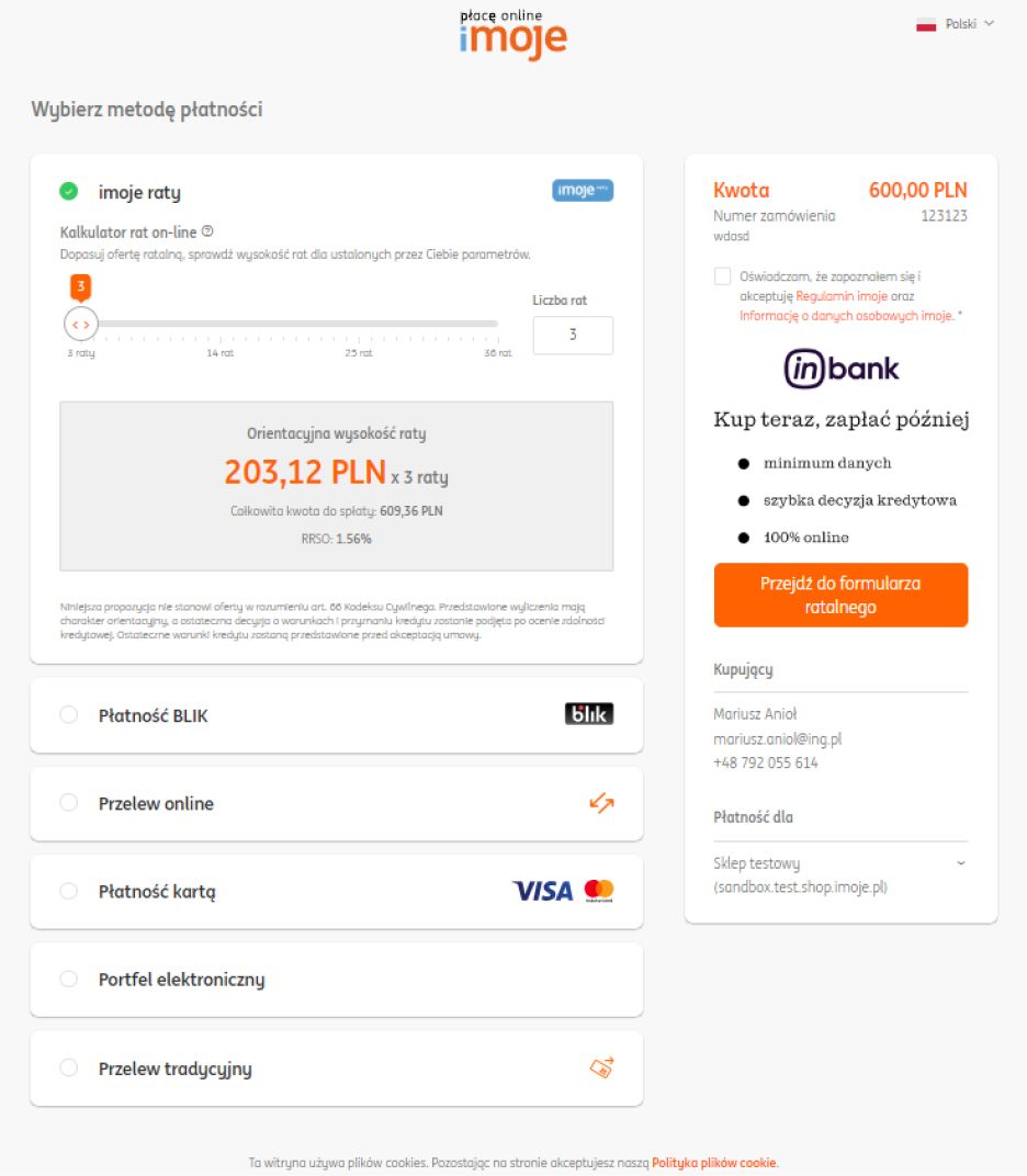 - imoje raty – wdrożyliśmy płatności ratalne we współpracy z Inbank, które pozwalają klientom sklepów internetowych sfinansować zakupy do 50 000 zł i rozłożyć płatność nawet na 60 rat. Wniosek składa się online, a decyzja jest od razu. Dla sklepu usługa jest bezpłatna!