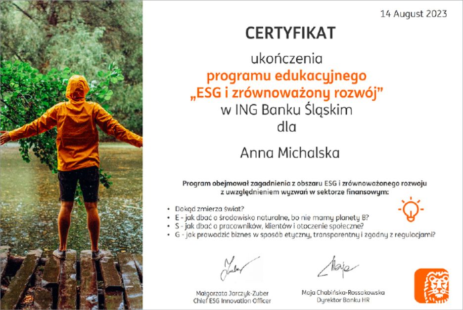 Wdrażanie ESG jest ważne dla zapewnienia przejrzystości, uczciwości i odpowiedzialności za podejmowane decyzje. W ING strategia ESG nie jest jedynie dodatkiem – to integralna część naszego modelu biznesowego. Działamy zgodnie z najwyższymi standardami etycznymi. Inwestujemy w zrównoważony rozwój: „Program grantowy ING”, ,,Program ocalimy świat”, „Leasing wspierający zrównoważony rozwój”. To tylko kilka przykładów, jak budujemy lepszą przyszłość zarówno dla nas, jak i dla następnych pokoleń. W końcu przyszłość to nasza wspólna odpowiedzialność!