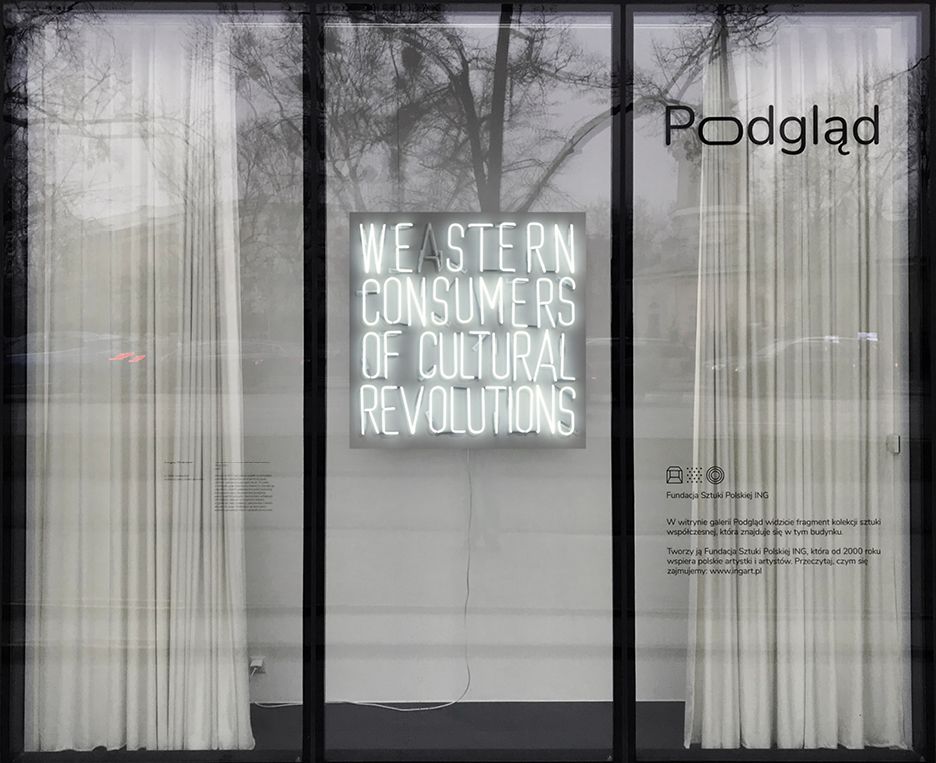 W lutym w witrynie naszej galerii mogliście zobaczyć neon „We are Stern Consumers of Cultural Revolutions” autorstwa Sergeya Shabohina. Neon to element projektu multimedialnego poświęconego dziedzictwu historycznej awangardowej grupy UNOVIS, założonej na początku lat 20. XX wieku w Witebsku przez Kazimierza Malewicza. Dorobek członków i członkiń grupy uznawany jest przez zachodnią kulturę za kluczowy dla światowej awangardy, jednak nieco zapomniany. Obecnie nie ma prawie żadnych oryginalnych dzieł, publikacji i dokumentów z okresu aktywności grupy. Zmieniający się tekst neonu podkreśla umowność historii i geografii artystycznej.