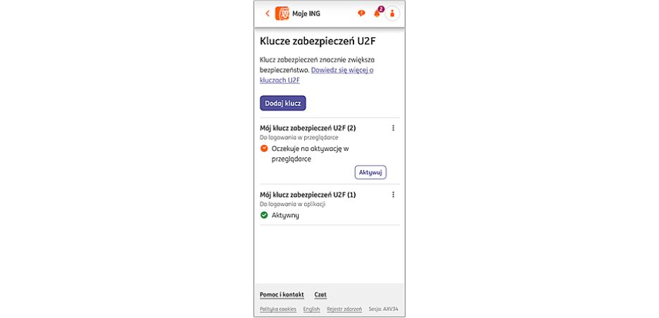 Podobnie jak w przypadku zaufanych przeglądarek, w sekcji Ustawienia -> Bezpieczeństwo klient odnajdzie listę kluczy zabezpieczeń. Może tam zarejestrować klucz, zmienić jego nazwę, a jeśli wcześniej użył U2F przy logowaniu, będzie mógł również samodzielnie aktywować lub usunąć aktywny klucz. Jeśli klient zgubi lub uszkodzi ostatni klucz, jaki posiada, aby zalogować się w Moim ING, będzie musiał wcześniej zlecić usunięcie klucza w miejscu spotkań lub na infolinii.