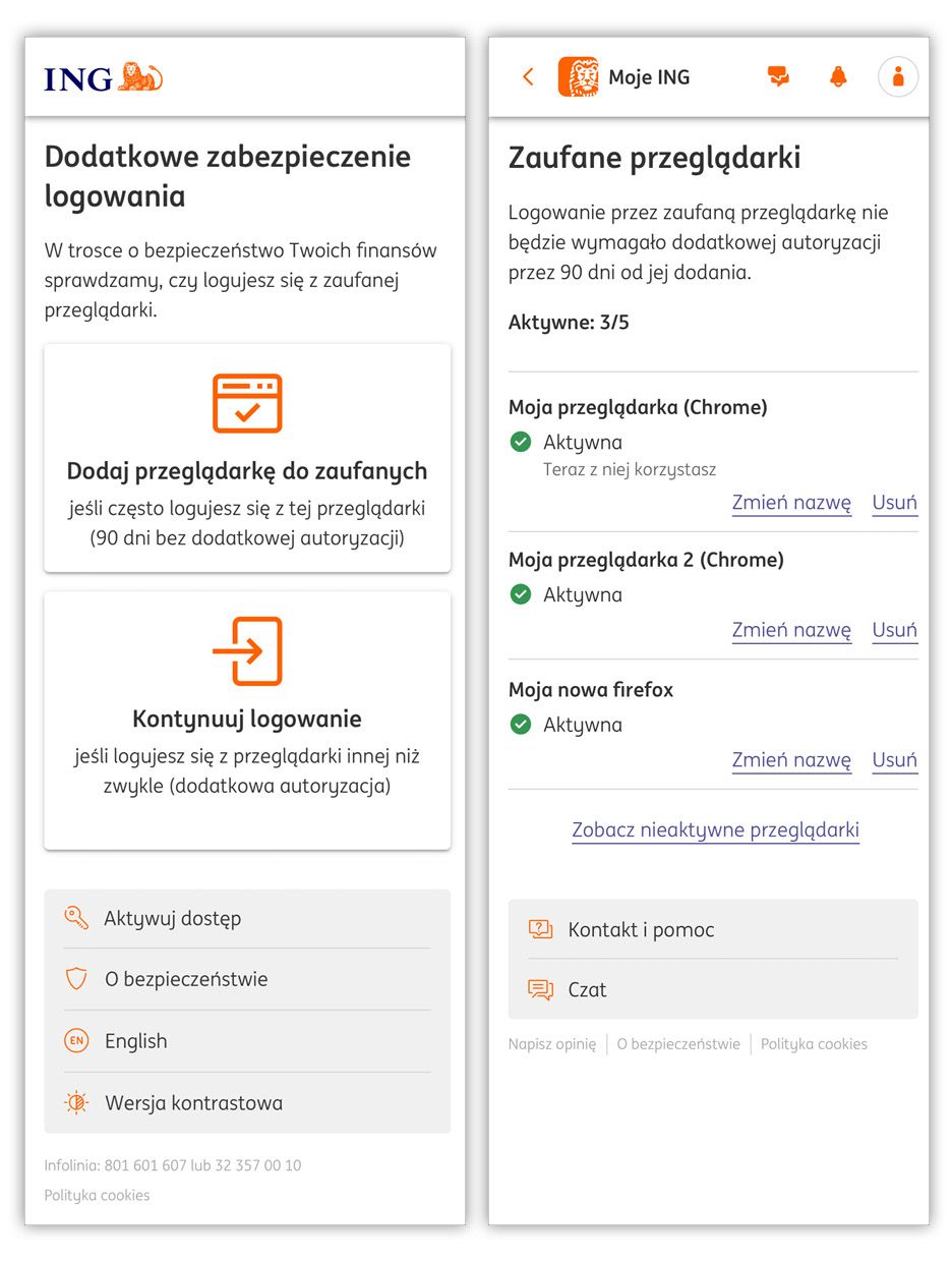 Aby rozwiązanie było zarówno bezpieczne, jak i wygodne dla użytkowników, dodaliśmy możliwość zapamiętania swojej przeglądarki internetowej jako zaufanej. Będzie ona ważna przez 90 dni i przez ten okres podczas logowania z niej nie będziemy prosić o dodatkowe potwierdzenie, poza sytuacją, gdy klient ma aktywny klucz U2F. Każdy użytkownik Mojego ING będzie mógł zapamiętać pięć przeglądarek. Ich lista wraz z opcjami dodania, usunięcia i zmiany nazwy znajduje się w sekcji Ustawienia -> Bezpieczeństwo w Moim ING.