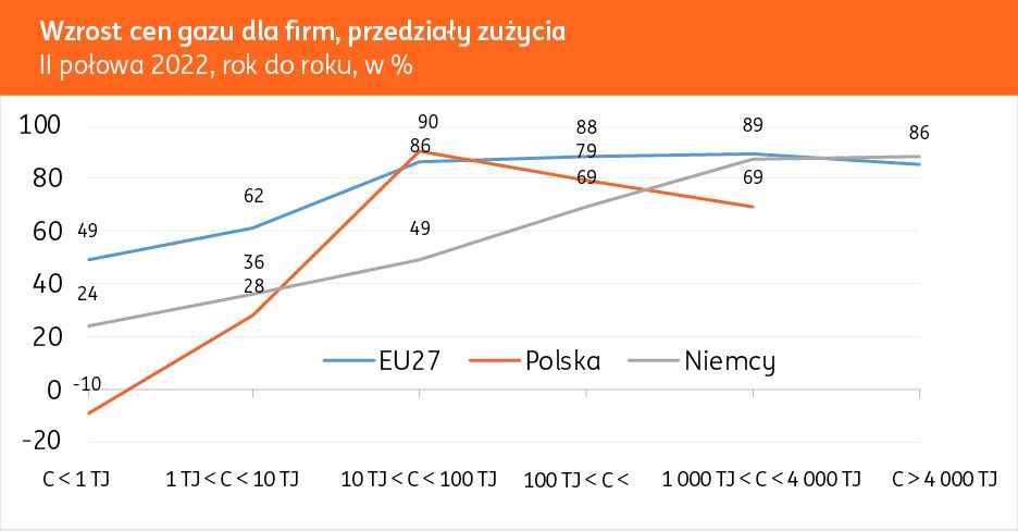 Przykładowo w II połowie 2022 roku ceny gazu ziemnego dla firm zużywających nie więcej niż 1 TJ (teradżul) gazu rocznie spadły o 10 proc. w porównaniu z II połową 2021 roku, natomiast dla przedziału zużycia między 10 a 100 TJ wzrosły w tym okresie o prawie 90 proc. Średnie wzrosty cen gazu dla firm w ub.r. były zróżnicowane w zależności od wielkości zużycia także w innych krajach, przykładowo w Niemczech bardzo wyraźnie – od 24 proc. do prawie 90 proc. rok do roku.