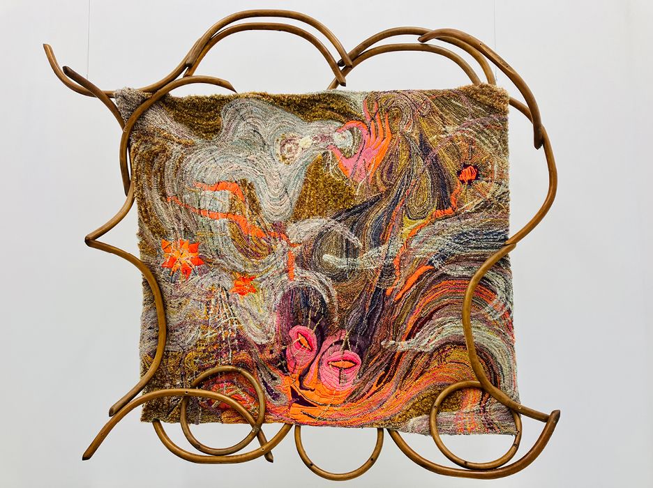 Marta Niedbał i Paweł Olszczyński, Rozpuszczanie, 2023, wełna, bawełna, jedwab na barwionej jucie, drewno, 182 x 210 cm