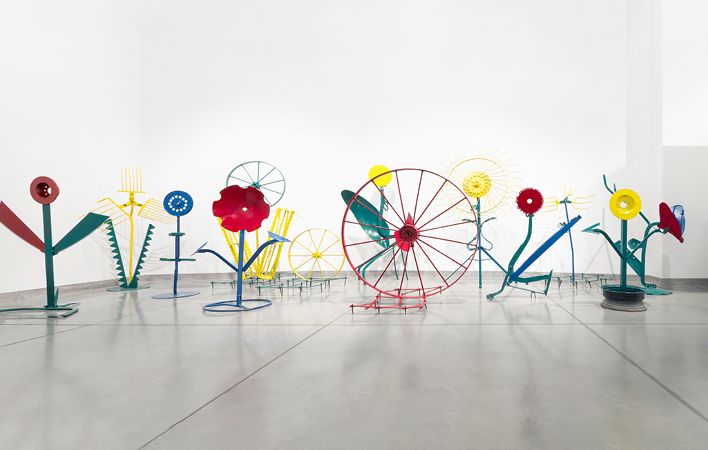 Daniel Rycharski, Ogród zimowy 2, 2023, metal, farba emaliowa (olejno-ftalowa), instalacja 13 obiektów, wymiary zmienne