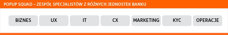 Definicję Popup Squad znajdziecie w Way of Working. To zespół ludzi, który pracuje nad złożonym, wielowątkowym projektem. Z jasno określonym zakresem, kryteriami i krótkim czasem wdrożenia. Nasz zespół połączył specjalistów z różnych jednostek banku.