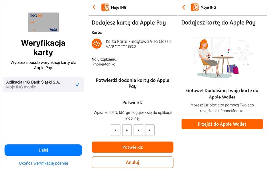 Poglądowe ekrany z procesu dodawania karty do Apple Pay – potwierdzenie w aplikacji Moje ING