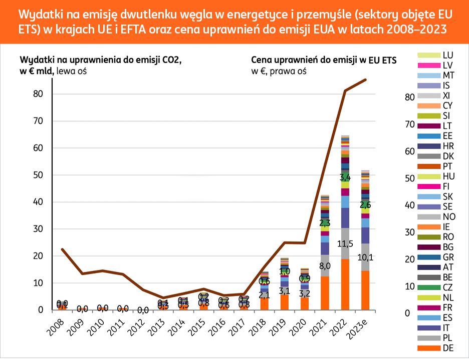 Wydatki na uprawnienia do emisji CO2 zależą od dwóch czynników: wielkości emisji (na którą składa się emisyjność produkcji i wielkość produkcji) i ceny uprawnień. Podczas gdy miksy krajów EŚW w ostatnich dekadach czy latach zazieleniały się stopniowo, zmiana ceny uprawnień do emisji CO2 w UE (EU allowances – EUA) w ostatnich kilku latach była skokowa. Ceny EUA wzrosły z niespełna 12 euro za tonę ekwiwalentu CO2 średnio w dekadzie 2010 r. do ponad 50 euro w 2021 r. i powyżej 80 euro w latach 2022-2023 (w 2024 r. spadły do średnio 65 euro w okresie styczeń–sierpień). Wzrost cen EUA był zbieżny z ambitnymi celami redukcji emisji gazów cieplarnianych w UE, rozpisanymi na sektory objęte systemem EU ETS (elektroenergetyka i przemysł), jak i w pozostałych sektorach (transport, budynki, rolnictwo, usługi i inne) oraz długoterminowym celem osiągnięcia zerowej emisji netto przez UE w 2050 r. Jako, że do obrotu prawami do emisji CO2 w UE zostały dopuszczone także instytucje finansowe, to w części przyczyniły się do wzrostu cen i wyższej zmienności notowań EUA.