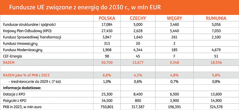 W tej dekadzie dostępnych jest wiele funduszy unijnych na wsparcie inwestycji energetycznych w krajach UE, a kraje EŚW są znaczącym beneficjentem. Na łączną pulę składają się głównie środki z funduszy strukturalnych i spójności oraz dotacji i pożyczek z KPO. Ich uzupełnieniem są środki przeznaczone dla regionów węglowych z Funduszu Sprawiedliwej Transformacji i innych funduszy. Łączna wartość środków unijnych na inwestycje związane z energią wynosi około 50 mld euro dla Polski, 19 mld euro dla Rumunii, 14 mld euro dla Czech i 9 mld euro dla Węgier. W relacji do PKB z 2023 roku kwoty te stanowią równowartość od 4,3 proc. PKB w Czechach do 6,8 proc. PKB w 2023 r. w Polsce. Po podzieleniu tej puli na 7 lat – ponieważ większość z tych funduszy jest dostępna przynajmniej od 2023 r. i może być wypłacana do 2029 r. – kwoty te stanowią równowartość 0,6-1,0 proc. PKB rocznie. Wyjątkiem są dotacje z KPO, które muszą zostać wypłacone i rozliczone do połowy 2026 r.