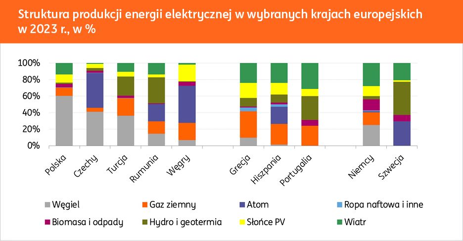 W regionie EŚW szczególnie Polska i Czechy nadal mają wysokoemisyjne miksy energetyczne. W 2023 r. około 60 proc. energii elektrycznej w Polsce było wytwarzane z węgla, w Czechach udział węgla wynosił ok. 40 proc., w Rumunii – 14 proc., a na Węgrzech – zaledwie 7 proc. Jednak w tych dwóch ostatnich krajach znacznie większy udział energii elektrycznej niż w Polsce czy Czechach był generowany z gazu ziemnego. Jest to nadal paliwo kopalne, choć tylko w około połowie tak wysokoemisyjne jak węgiel. W południowych krajach UE jedynie miks energii elektrycznej w Grecji – z 10-procentowym udziałem węgla i 32–procentowym udziałem gazu ziemnego – przypomina strukturalną charakterystykę regionu Europy Środkowo-Wschodniej, w Hiszpanii i Portugalii względne wykorzystanie paliw kopalnych jest znacznie niższe. Ponownie nie wspominając o Szwecji, gdzie miks energii elektrycznej opiera się na energii jądrowej i wodnej oraz innych odnawialnych źródłach energii (OZE), w szczególności wietrze i biomasie.