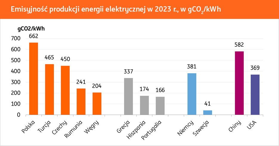 Miks energetyczny odzwierciedla także zbiorczy wskaźnik emisyjności produkcji energii elektrycznej. Polska, z emisją 662 g CO2 na wytworzenie 1 kWh energii elektrycznej w 2023 r., zdecydowanie prowadziła w tym niechlubnym rankingu, wyprzedzając Turcję, Czechy, Rumunię i Węgry. Grecja ponownie wyprzedza dwa ostatnie kraje EŚW, ale jednocześnie znacznie różni się od Hiszpanii i Portugalii. Co ciekawe, emisyjność produkcji prądu w Niemczech w 2023 r. była porównywalna z USA, choć znacznie niższa niż w Chinach. Jednak wskaźnik ten dla krajów spoza UE nie wpływa na wysokie ceny energii elektrycznej, ponieważ ceny emisji dwutlenku węgla są tam kilkakrotnie niższe niż w EU ETS.
