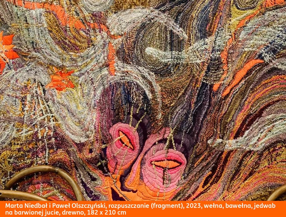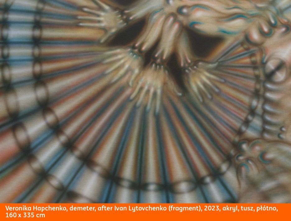W tym roku jury ponownie przyznało dwie Nagrody Główne. Pierwsza z nich trafiła do Veroniki Hapchenko za wystawę „Interloper” w galerii Import/Export. Drugą otrzymali Marta Niedbał i Paweł Olszczyński za wystawę „Hold Me Closer” w HOS Gallery. Hapchenko na swoich płótnach przeplata współczesność z sowieckim dziedzictwem. Obraz „demeter, after Ivan Lytovchenko”, który trafił do kolekcji, należy do cyklu „Mozaiki” i inspirowany jest realizacjami powstałymi na kilka lat przed wybuchem reaktora w Czarnobylu, w dzisiaj już opuszczonej, Prypeci. Oryginalna mozaika zatytułowana „Stworzenie” ukazuje grecką boginię plonów Demeter. Hapchenko wchodzi w dialog z mozaikami po tym, jak wojska rosyjskie wkroczyły do Prypeci w 2022 roku. Jako druga nagroda do kolekcji trafiła praca „Rozpuszczanie” Marty Niedbał i Pawła Olszczyńskiego – obiekt łączący tkaninę artystyczną, malarstwo i instalację. Praca była tworzona wspólnie przez dwójkę artystów, niwelując granice autorstwa i granice własnego ego, a w dialogu tworząc zupełnie nowa jakość. Pracę „Rozpuszczanie” zobaczycie w siedzibie Fundacji, obraz Hapchenko został wypożyczony na wystawę „The Colour of Energy” towarzyszącą targom viennaartcontemporary w Wiedniu.