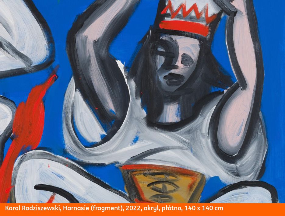 Kolejnym laureatem Nagrody Fundacji został Karol Radziszewski, wyróżniony za wystawę „Mity” w BWA Warszawa i jego krytyczne badania nad queerową historiografią, pamięcią oraz tożsamością narodową. Prace zaprezentowane na wystawie były rozwinięciem cyklu „Poczet”, w którego ramach portretował wybitne postaci polskiej kultury, a których nieheteronormatywność nie wybrzmiała nigdy w społecznym obiegu. Należał do nich Karol Szymanowski, któremu poświęcona została wystawa artysty w ramach Warsaw Gallery Weekend. Praca „Harnasie”, która weszła do kolekcji Fundacji, odnosi się do słynnego baletu kompozytora oraz sceny tańczących zbójników. Możecie ją oglądać w naszej siedzibie.