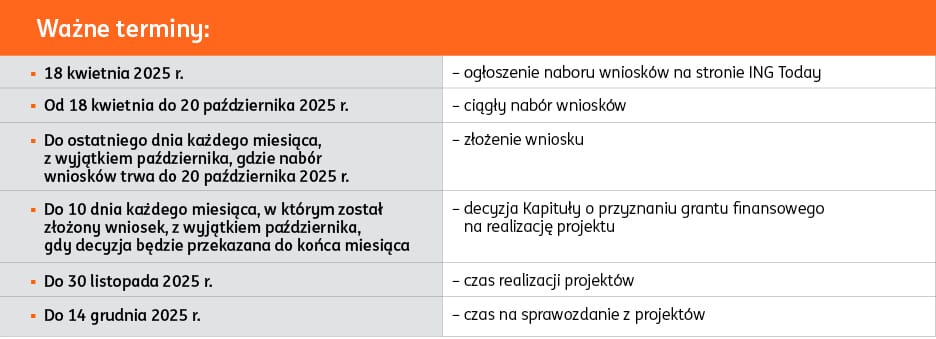 - Jeśli projekt ma charakter doraźny, wynikający z sytuacji nagłej, lider projektu może zgłosić się do Fundacji ING Dzieciom z prośbą o szybsze rozpatrzenie wniosku.