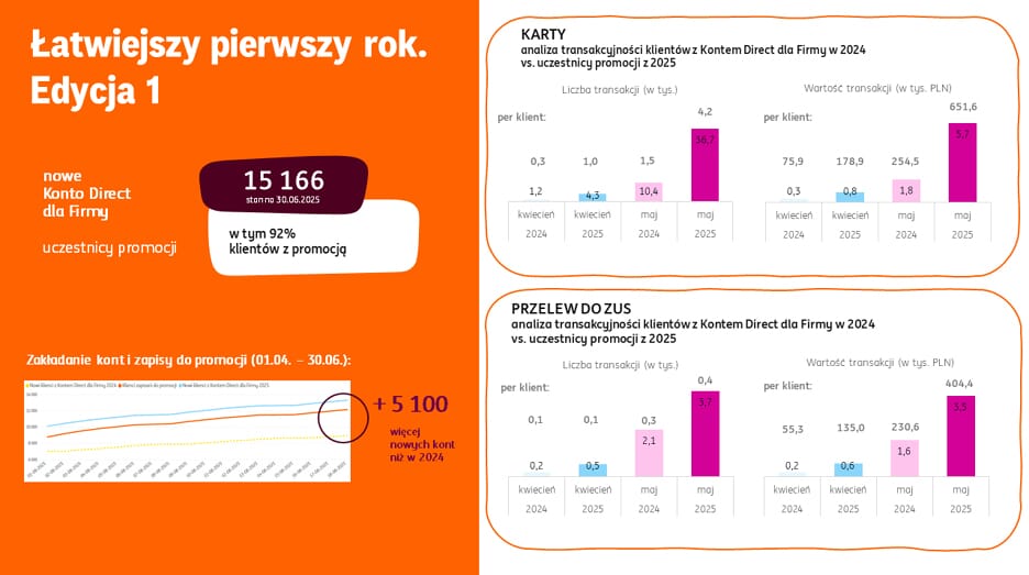 Promocja Łatwiejszy pierwszy rok budzi zainteresowanie – od początku kwietnia do końca czerwca otworzyliśmy 15 166 nowych Kont Direct dla Firmy! To przyrost o 34 proc. w porównaniu z analogicznym okresem 2024 r. Z tego do promocji przystąpiło blisko 14 tys. przedsiębiorców (92 proc.).