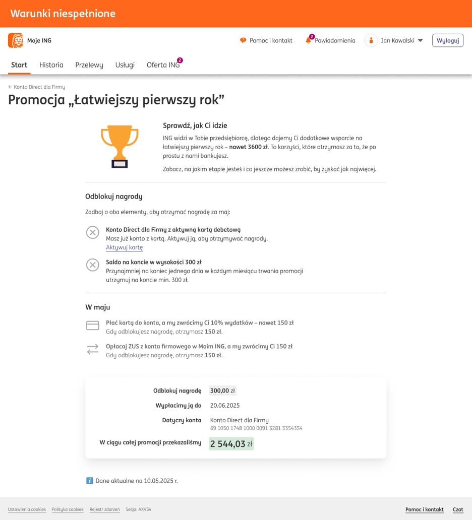 W ING na ten sam problem postanowiliśmy spojrzeć z szerszej perspektywy. Po pierwsze bonus powinien być łatwo osiągalny, aby dotrzeć do jak najszerszej grupy przedsiębiorców. Zależało nam, aby klienci otrzymali nagrodę za coś co faktycznie jest w ich zasięgu. Nie tworzymy tym samym sztucznych obietnic, ale pokazujemy, że bankując z nami, po prostu zyskujesz.