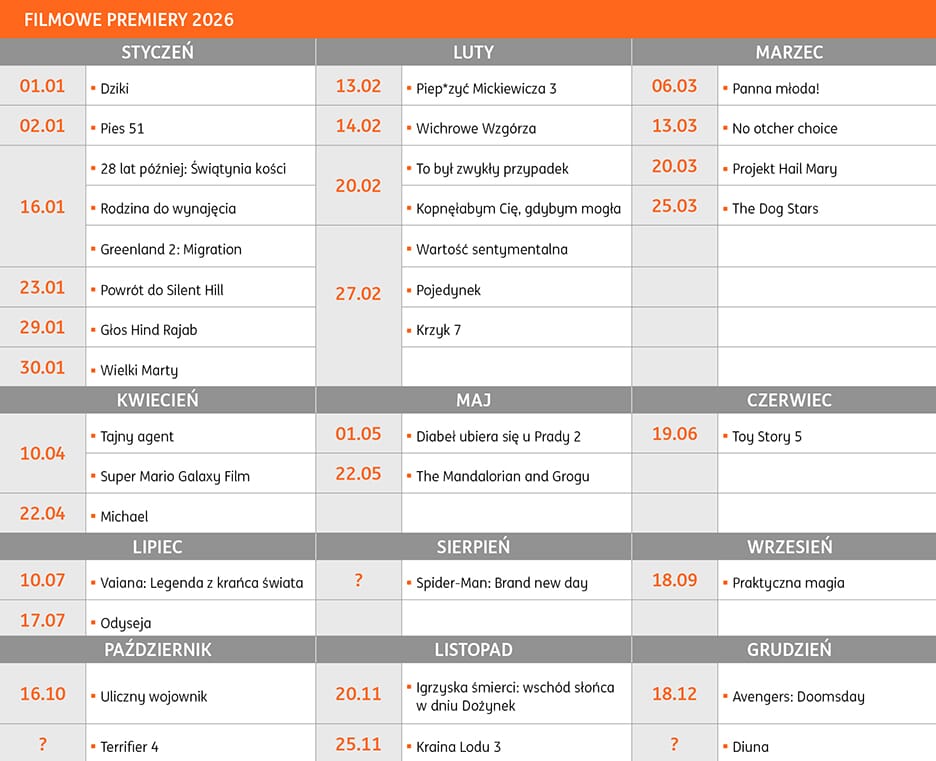 Lista premier w polskich kinach na rok 2026 najwięcej emocji wzbudza chyba wśród tych, którzy uwielbiają kontynuacje dawnych hitów, dzieci i fanów sci-fi. Inni także znajdą coś dla siebie, jednak te trzy grupy będą miały największy wybór.